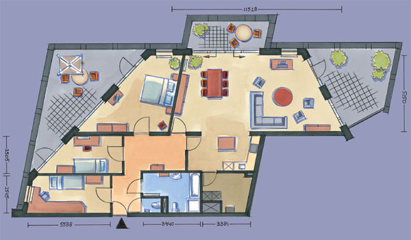 Evenals bij type A beschikt het appartement op de eerste verdieping hier ook, naast het mooie balkon, over twee extra dakterrassen die zo mogelijk nog wat groter zijn dan bij woningtype A.