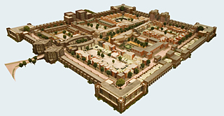 symmetrisch bouwwerk met op de hoeken kenmerkende torens en fortressen.