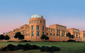 hoeken worden gemarkeerd door ronde torens met twee riante woningen per toren.