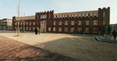 bakstenen gevels en straten staan in contrast met het midden van het plein. De